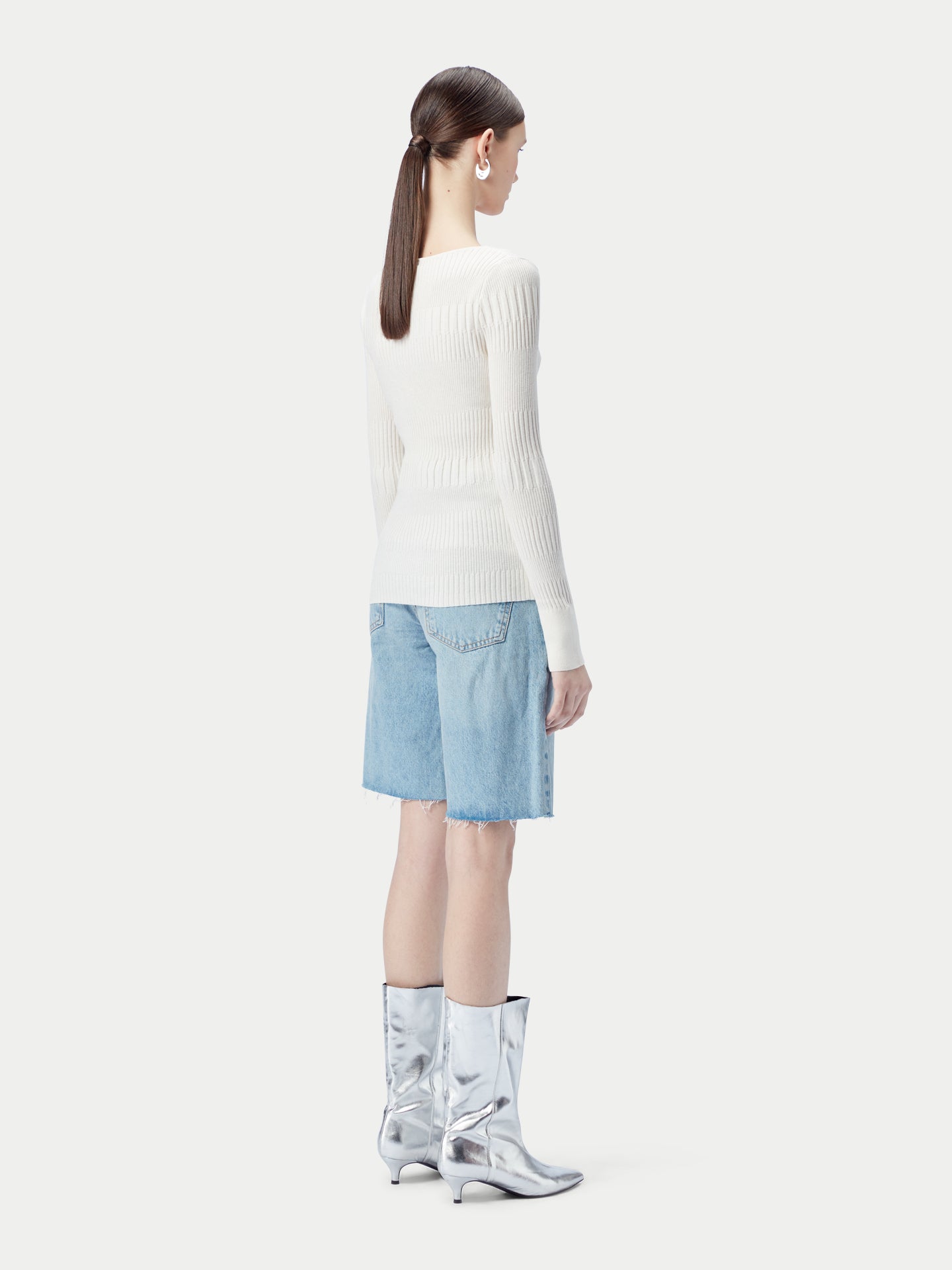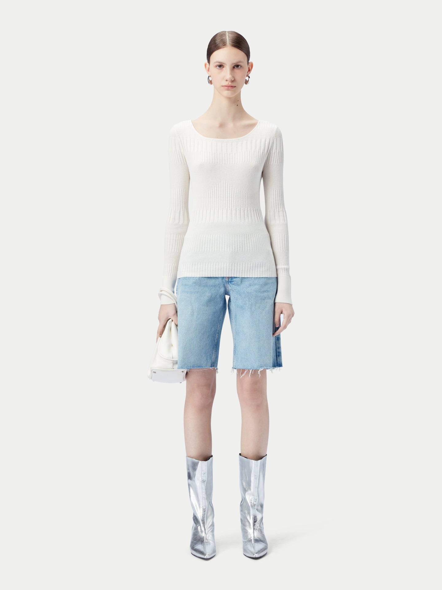 A ribbed cotton silk cashmere blend sweater in a beige color with a round neckline. #color_whisper-white